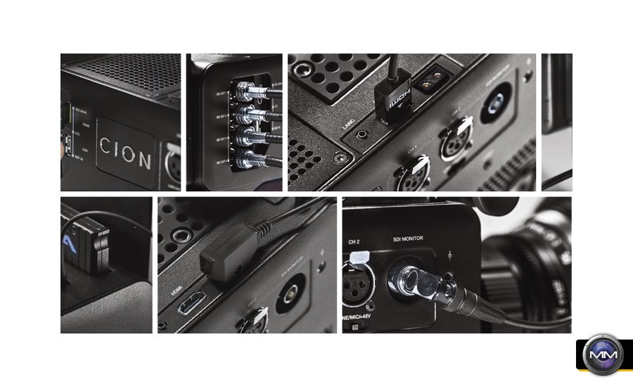 Industrial design: Lightweight magnesium chassis, built-in confidence monitor, standard playback controls and connectors placed to optimize functionality. Integrated cheese plates fitted to both the top and the bottom of the chassis provide easy mounting of accessories. All CION accessory connection points use open standards, including 15mm rods, 1/4-20 and 3/8-16 threaded holes, and M6 hirth-tooth rosettes.