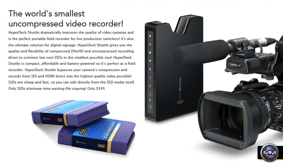 ProRes 422 (HQ) offers the highest quality for 4:2:2 with minimal generation loss as well as fast export and is one of the most popular video formats for high end post production and broadcast. HyperDeck Shuttle turns low cost cameras into high end broadcast cameras because it allows video file recording to bypass the camera’s compression by recording from SDI and HDMI directly to either 10-bit uncompressed QuickTime, Avid DNxHD MXF and now Apple ProRes 422 (HQ) formats. SSDs are cheap and fast, and can be plugged into an eSATA dock for instant access to the media files, so are the most flexible recording medium available.