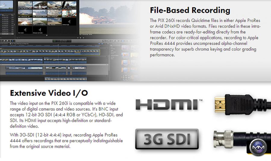 The PIX 260i brings the features and tools needed by production companies and broadcasters looking to migrate to file-based recording and playback environments. It records QuickTime files in either Apple ProRes or Avid DNxHD video formats. Files recorded in these intra-frame codecs are ready for editing directly from the recorder in common editing environments, such as Avid, Final Cut Pro, and Adobe Premiere, eliminating time-consuming transferring and transcoding. For color-critical applications, the PIX 260i supports Apple ProRes 4444 through its 12-bit, 4:4:4 3G-SDI I/O. Users can also play out files from the PIX 260i for real-time applications.