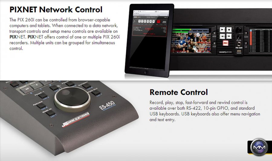 Another key feature of the PIX 260i is that it can be controlled from browser-capable computers and tablets. When connected to a data network, transport controls and setup menu controls are available on PIXNET, which offers control of one or multiple PIX 260i recorders. Multiple units can be grouped for simultaneous control.