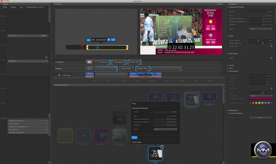ToolsOnAir provides powerful, intuitive QuickTime-based applications designed to create a professional, fully functional broadcast production facility using Mac OS X and low-cost, off-the-shelf hardware components. The ToolsOnAir just: suite is designed with live broadcast production in mind, integrating video, audio and graphics, along with automation, asset management and multiple format capabilities. Full QuickTime and MXF compatibility eliminates time-intensive file conversion, and a powerful, intuitive GUI streamlines the workflow from ingest to playout.